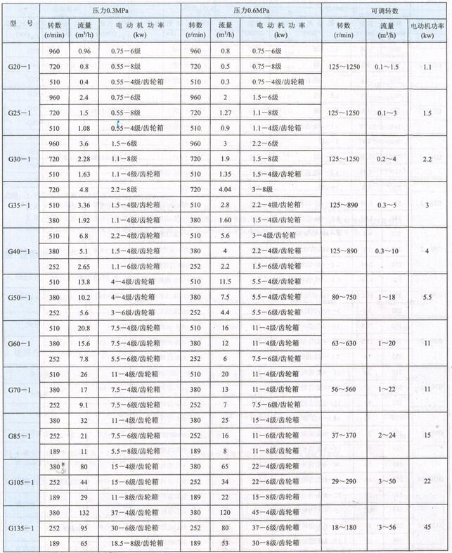 G型卫生级螺杆泵性能参数表